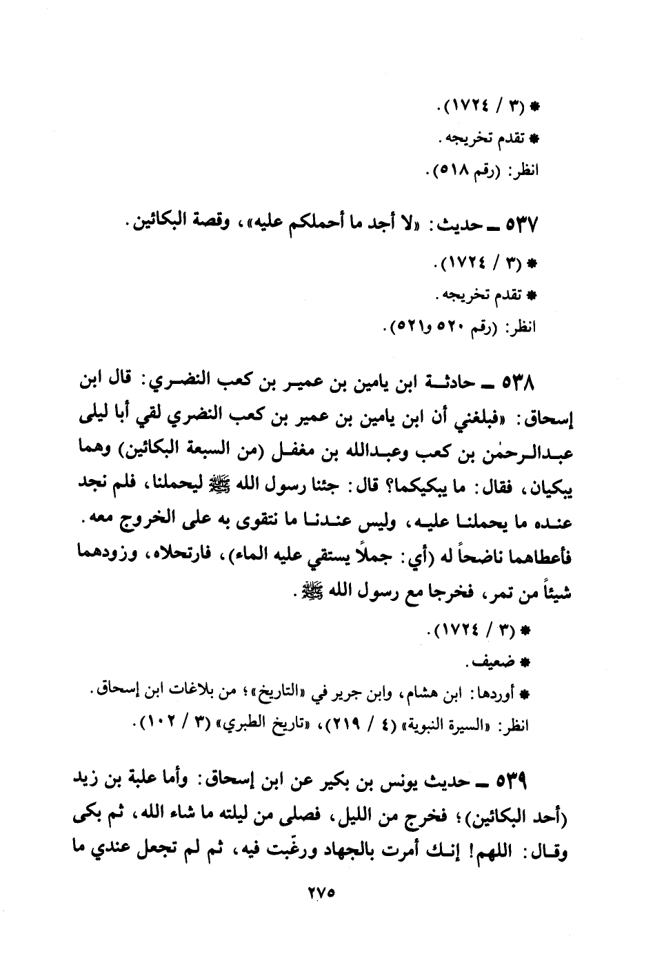 539 - حديث يونس بن بكير عن ابن إسحاق: وأما علبة بن زيد (أحد البكائين) ؛ فخرج من الليل، فصلى من ليلته ما شاء الله، ثم بكى وقال: اللهم! إنك أمرت بالجهاد ورغَّبت فيه، ثم لم تجعل عندي ما