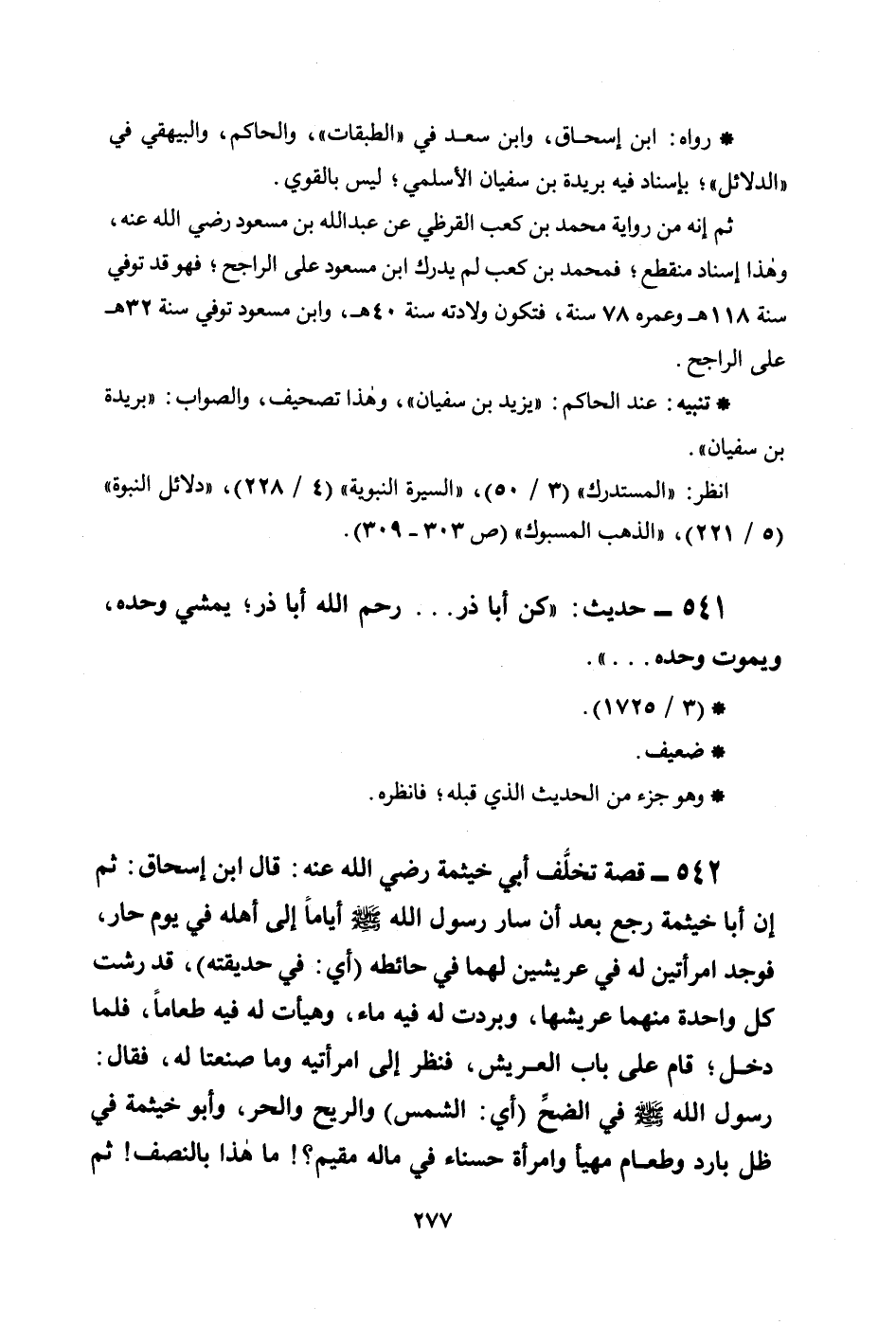 542 - قصة تخلُّف أبي خيثمة رضي الله عنه: قال ابن إسحاق: ثم إن أبا خيثمة رجع بعد أن سار رسول الله صلى الله عليه وسلم أياماً إلى أهله في يوم حار، فوجد امرأتين له في عريشين لهما في حائطه (أي: في حديقته) ، قد رشت كل واحدة منهما عريشها، وبردت له فيه ماء، وهيأت له فيه طعاماً، فلما دخل؛ قام على باب العريش، فنظر إلى امرأتيه وما صنعتا له، فقال رسول الله صلى الله عليه وسلم في الضحِّ (أي: الشمس) والريح والحر، وأبو خيثمة في ظل بارد وطعام مهيأ وامرأة حسناء في ماله مقيم؟! ما هذا بالنصف! ثم