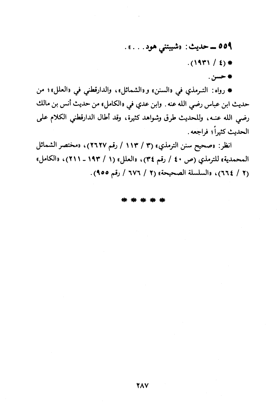 انظر: ((صحيح سنن الترمذي)) (3/113/رقم2627) ، ((مختصر الشمائل المحمدية)) للترمذي (ص40/رقم34) ، ((العلل)) (1/193-211) ، ((الكامل)) (2/664) ، ((السلسلة الصحيحة)) (2/676/رقم955) .
