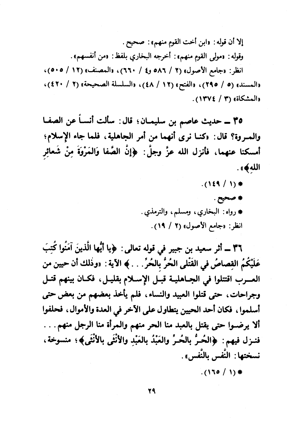 35 - حديث عاصم بن سليمان؛ قال: سألت أنساً عن الصفا والمروة؟ قال: ((كنا نرى أنهما من أمر الجاهلية، فلما جاء الإسلام؛ أمسكنا عنهما، فأنزل الله عزَّ وجلَّ: {إِنَّ الصَّفَا وَالْمَرْوَةَ مِن شَعَائِرِ اللهِ} )) .