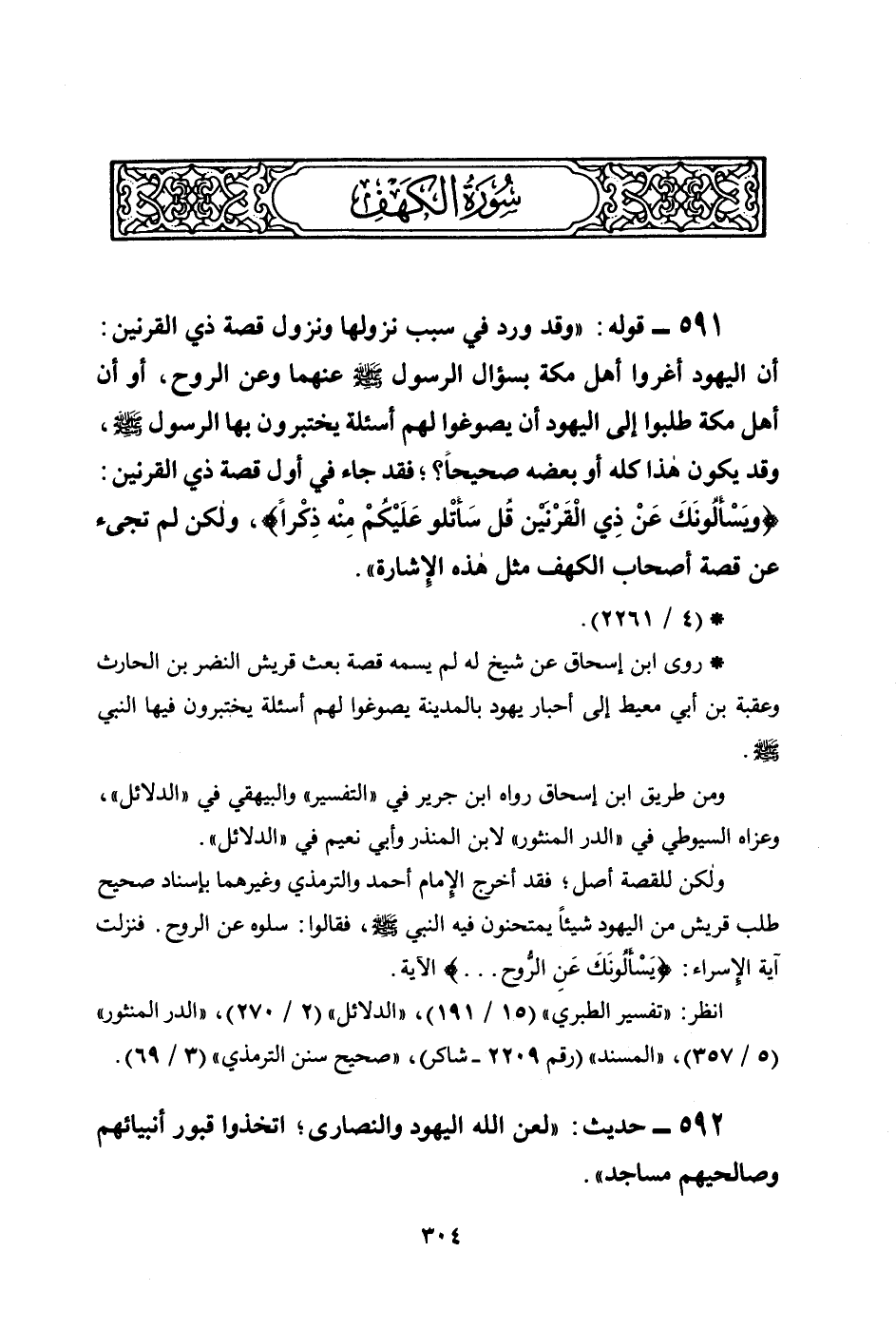 591 - قوله: ((وقد ورد في سبب نزولها ونزول قصة ذي القرنين: أن اليهود أغروا أهل مكة بسؤال الرسول صلى الله عليه وسلم عنهما وعن الروح، أو أن أهل مكة طلبوا إلى اليهود أن يصوغوا لهم أسئلة يختبرون بها الرسول صلى الله عليه وسلم، وقد يكون هذا كله أو بعضه صحيحاً؛ فقد جاء في أول قصة ذي القرنين: {وَيَسْأَلُونَكَ عَن ذِي الْقَرْنَيْنِ قُلْ سَأَتْلُو عَلَيْكُم مِّنْهُ ذِكْراً} ، ولكن لم تجئ عن قصة أصحاب الكهف مثل هذه الإشارة)) .