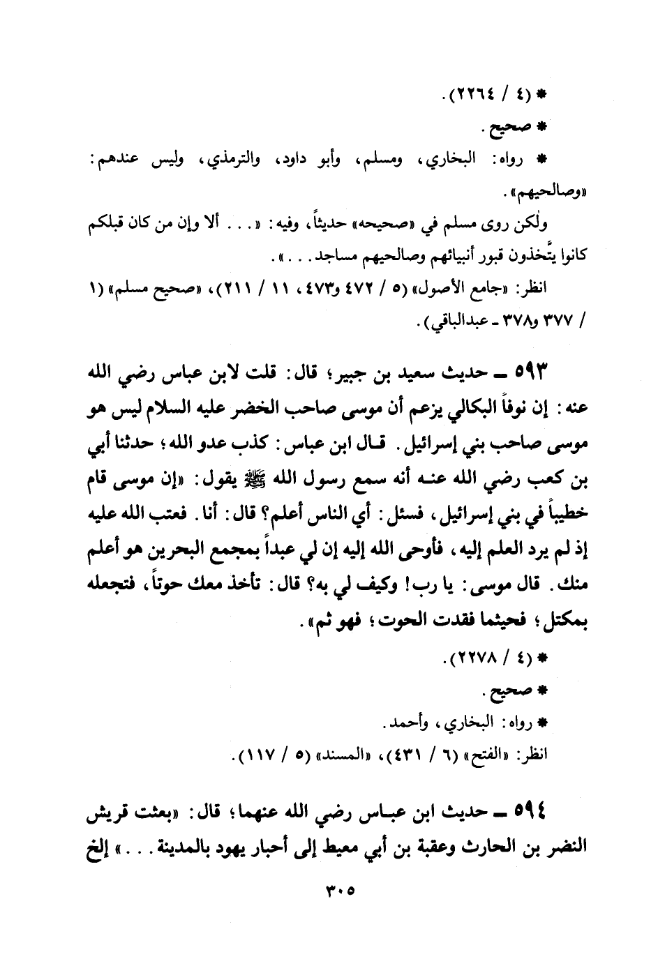 593 - حديث سعيد بن جبير؛ قال: قلت لابن عباس رضي الله عنهما: إن نوفاً البكالي يزعم أن موسى صاحب الخضر عليه السلام ليس هو موسى صاحب بني إسرائيل. قال ابن عباس: كذب عدو الله؛ حدثنا أُبيُّ بن كعب رضي الله عنه أنه سمع رسول الله صلى الله عليه وسلم يقول: ((إن موسى قام خطيباً في بني إسرائيل، فسئل: أي الناس أعلم؟ قال: أنا. فعتب الله عليه إذ لم يرد العلم إليه، فأوحى الله إليه إن لي عبداً بمجمع البحرين هو أعلم منك. قال موسى: يا رب! وكيف لي به؟ قال: تأخذ معك حوتاً، فتجعله بمكتل؛ فحيثما فقدت الحوت؛ فهو ثم)) .