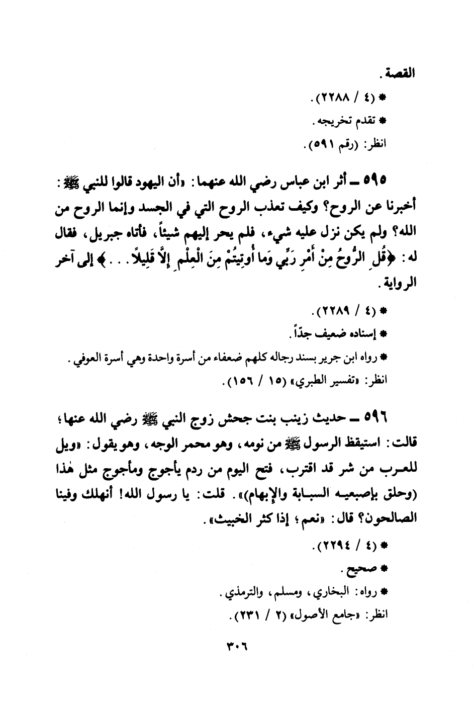 595 - أثر ابن عباس رضي الله عنهما: ((أن اليهود قالوا للنبي صلى الله عليه وسلم: أخبرنا عن الروح؟ وكيف تعذب الروح التي في الجسد وإنما الروح من الله؟ ولم يكن نزل عليه شيء، فلم يحر إليهم شيئاً، فأتاه جبريل، فقال له: {قُلِ الرُّوحُ مِن أَمْرِ رَبِّي وَمَا أُوتِيتُم مِّنَ الْعِلْمِ إِلاَّ قَلِيلاً ... } إلى آخر الرواية.