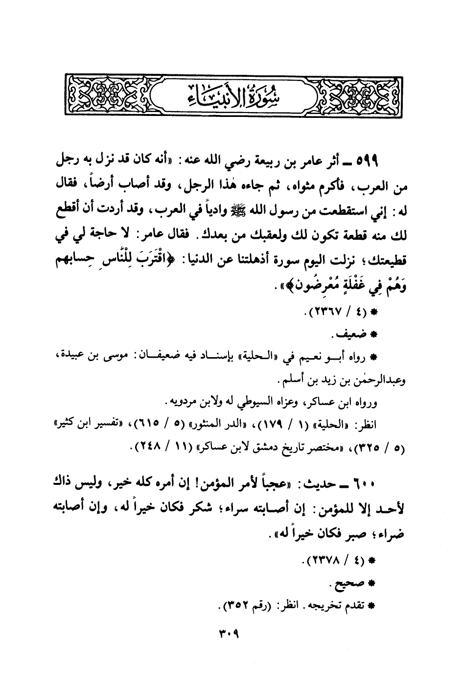 599 - أثر عامر بن ربيعة رضي الله عنه: ((أنه كان قد نزل به رجل من العرب، فأكرم مثواه، ثم جاءه هذا الرجل، وقد أصاب أرضاً، فقال له: إني استقطعت من رسول الله صلى الله عليه وسلم وادياً في العرب، وقد أردت أن أقطع لك منه قطعة تكون لك ولعقبك من بعدك. فقال عامر: لا حاجة لي في قطيعتك؛ نزلت اليوم سورة أذهلتنا عن الدنيا: {اقْتَرَبَ لِلنَّاسِ حِسَابُهُمْ وَهُمْ فِي غَفْلَةٍ مُّعْرِضُونَ} )) .