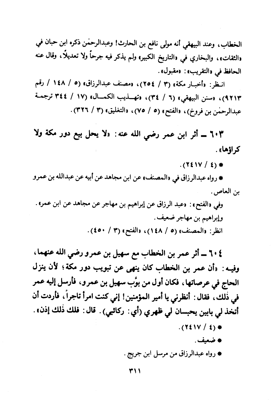 604 - أثر عمر بن الخطاب مع سهيل بن عمرو رضي الله عنهما، وفيه: ((أن عمر بن الخطاب كان ينهى عن تبويب دور مكة؛ لأن ينزل الحاج في عرصاتها، فكان أول من بوَّب سهيل بن عمرو، فأرسل إليه عمر في ذلك، فقال: أنظرني يا أمير المؤمنين! إني كنت امرأ تاجراً، فأردت أن أتخذ لي بابين يحبسان لي ظهري (أي: ركائبي) . قال: فلك ذلك إذن)) .