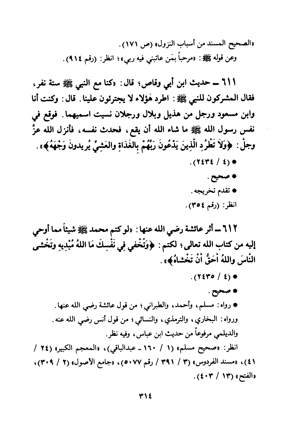 611 - حديث ابن أبي وقاص؛ قال: ((كنا مع النبي صلى الله عليه وسلم ستة نفر، فقال المشركون للنبي صلى الله عليه وسلم: اطرد هؤلاء لا يجترئون علينا. قال: وكنت أنا وابن مسعود ورجل من هذيل وبلال ورجلان نسيت اسميهما. فوقع في نفس رسول الله صلى الله عليه وسلم ما شاء الله أن يقع، فحدث نفسه، فأنزل الله عزَّ وجلَّ: {وَلاَ تَطْرُدِ الَّذِينَ يَدْعُونَ رَبَّهُم بِالْغَدَاةِ وَالْعَشِيِّ يُرِيدُونَ وَجْهَهُ} )) .