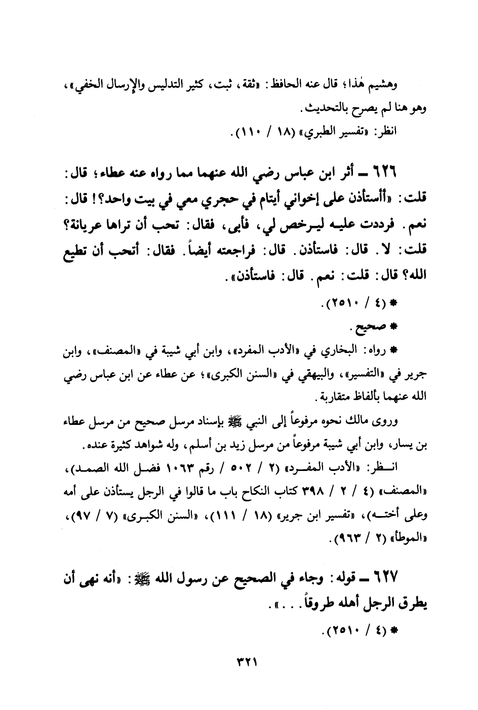 626 - أثر ابن عباس رضي الله عنهما مما رواه عنه عطاء؛ قال: قلت: ((أأستأذن على إخواني أيتام في حجري معي في بيت واحد؟! قال: نعم. فرددت عليه ليرخص لي، فأبى، فقال: تحب أن تراها عريانة؟ قلت: لا. قال: فاستأذن. قال: فراجعته أيضاً. فقال: أتحب أن تطيع الله؟ قال: قلت: نعم. قال: فاستأذن)) ..