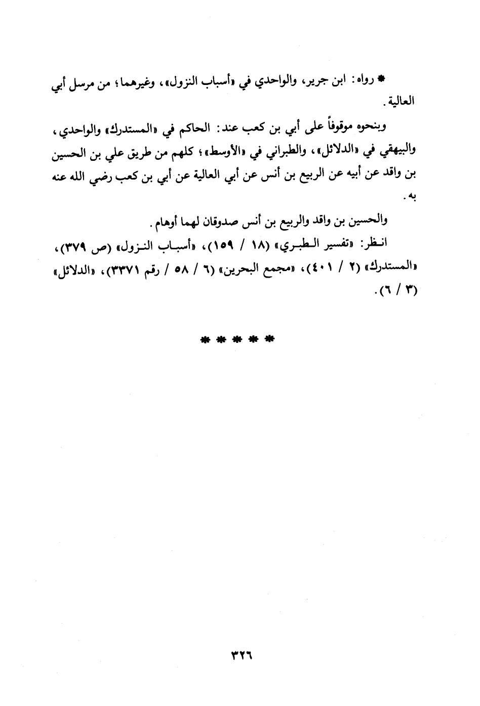 وبنحوه موقوفاً على أبي بن كعب عند: الحاكم في ((المستدرك)) والواحدي، والبيهقي في ((الدلائل)) ، والطبراني في ((الأوسط)) ؛ كلهم من طريق علي بن الحسين بن واقد عن أبيه عن الربيع بن أنس عن أبي العالية عن أبي بن كعب رضي الله عنه به.