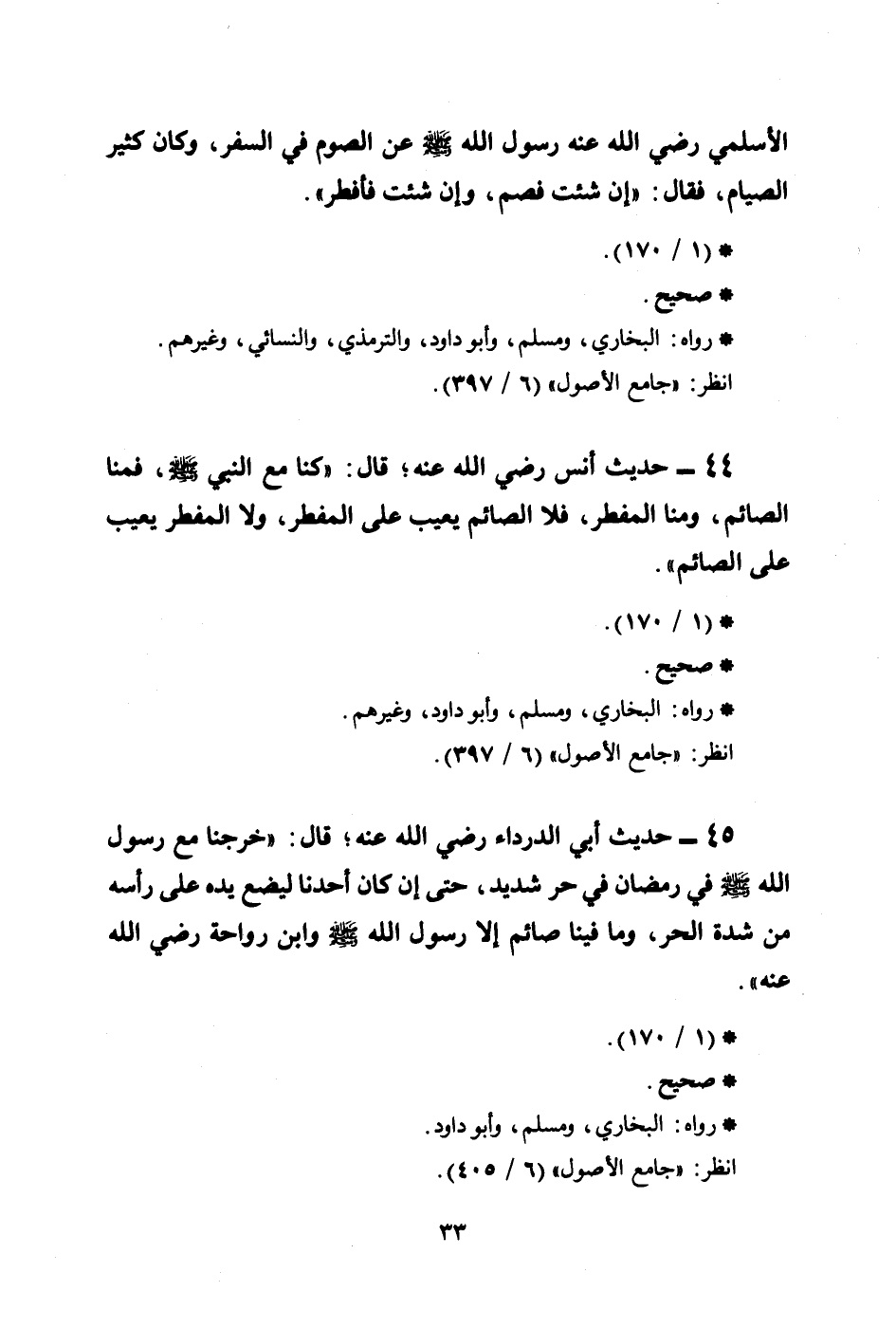 45 - حديث أبي الدرداء رضي الله عنه؛ قال: ((خرجنا مع رسول الله صلى الله عليه وسلم في رمضان في حر شديد، حتى إن كان أحدنا ليضع يده على رأسه من شدة الحر، وما فينا صائم إلا رسول الله صلى الله عليه وسلم وابن رواحة رضي الله عنه)) .