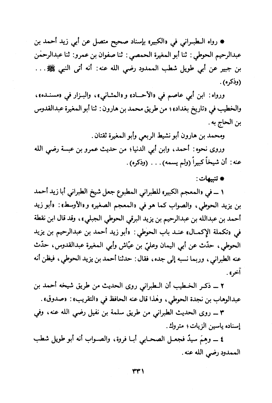 - رواه الطبراني في ((الكبير)) بإسناد صحيح متصل عن أبي زيد أحمد بن عبد الرحيم الحوطي: ثنا أبو المغيرة الحمصي: ثنا صفوان بن عمرو: ثنا عبد الرحمن بن جبير عن أبي طويل شطب الممدود رضي الله عنه: أنه أتى النبي صلى الله عليه وسلم ... (وذكره) .