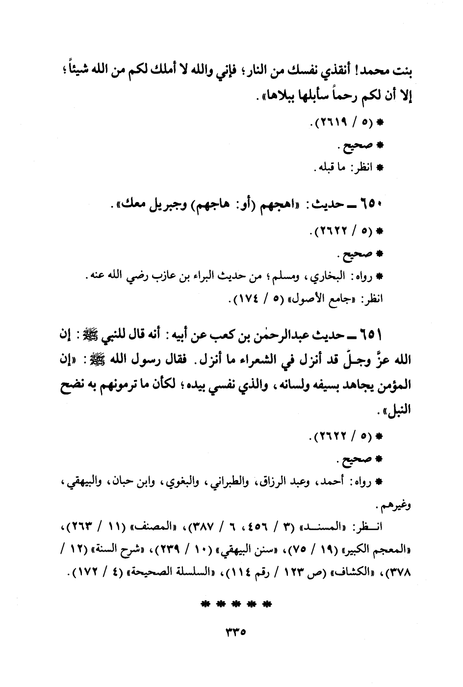 651 - حديث عبد الرحمن بن كعب عن أبيه: أنه قال للنبي صلى الله عليه وسلم: إن الله عزَّ وجلَّ قد أنزل في الشعراء ما أنزل. فقال رسول الله صلى الله عليه وسلم: ((إن المؤمن يجاهد بسيفه ولسانه، والذي نفسي بيده؛ لكأن ما ترمونهم به نضح النبل)) .