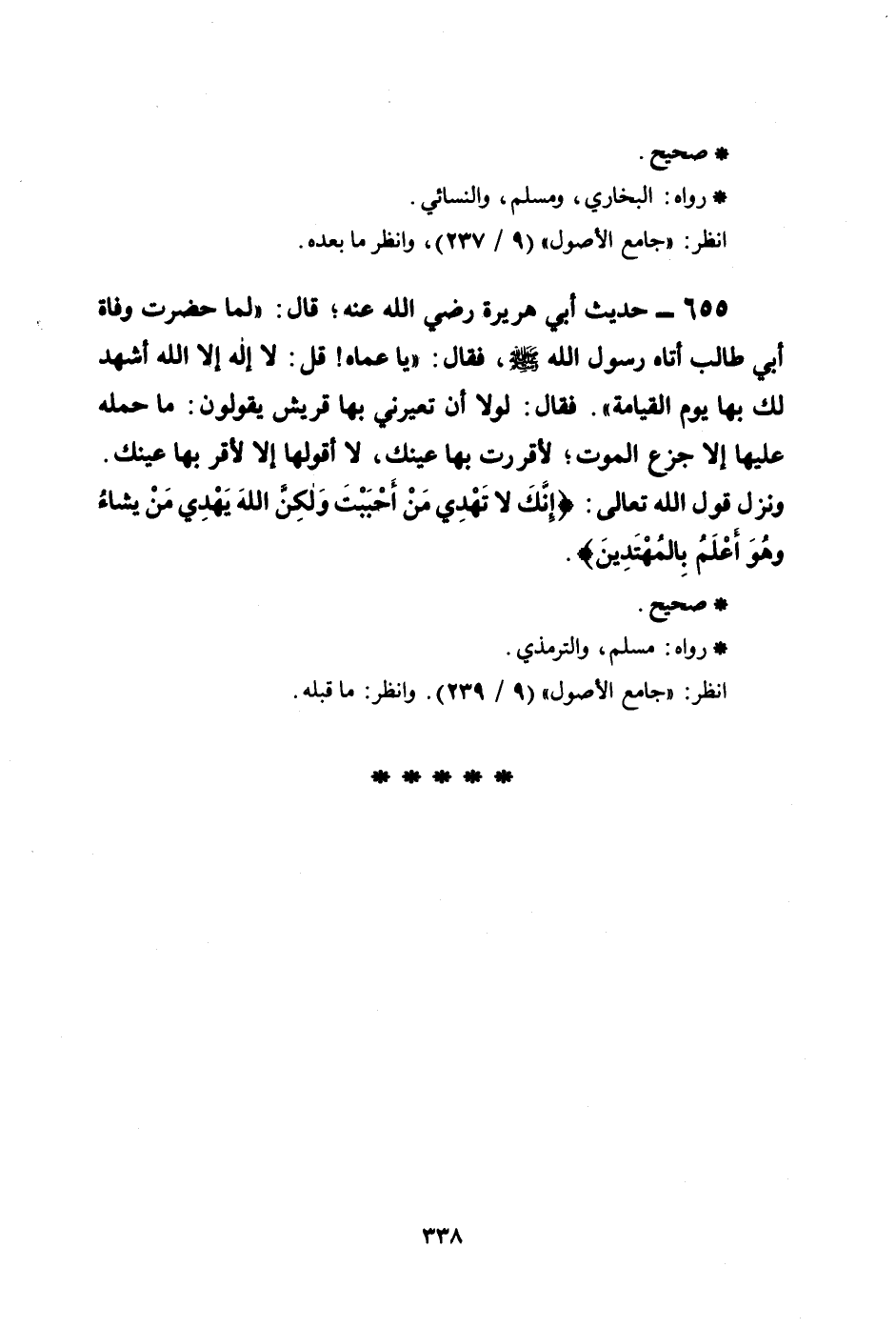 655 - حديث أبي هريرة رضي الله عنه؛ قال: ((لما حضرت وفاة أبي طالب أتاه رسول الله صلى الله عليه وسلم، فقال: ((يا عماه! قل: لا إله إلا الله أشهد لك بها يوم القيامة)) . فقال: لولا أن تعيرني بها قريش يقولون: ما حمله عليها إلا جزع الموت؛ لأقررت بها عينك، لا أقولها إلا لأقر بها عينك. ونزل قول الله تعالى: {إِنَّكَ لاَ تَهْدِي مَنْ أَحْبَبْتَ وَلَكِنَّ اللهَ يَهْدِي مَن يَّشَاءُ وَهُوَ أَعْلَمُ بِالْمُهْتَدِينَ} .