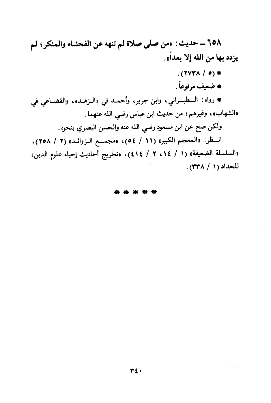 658 - حديث: ((من صلى صلاة لم تنهه عن الفحشاء والمنكر؛ لم يزدد بها من الله إلا بعداً)) .
