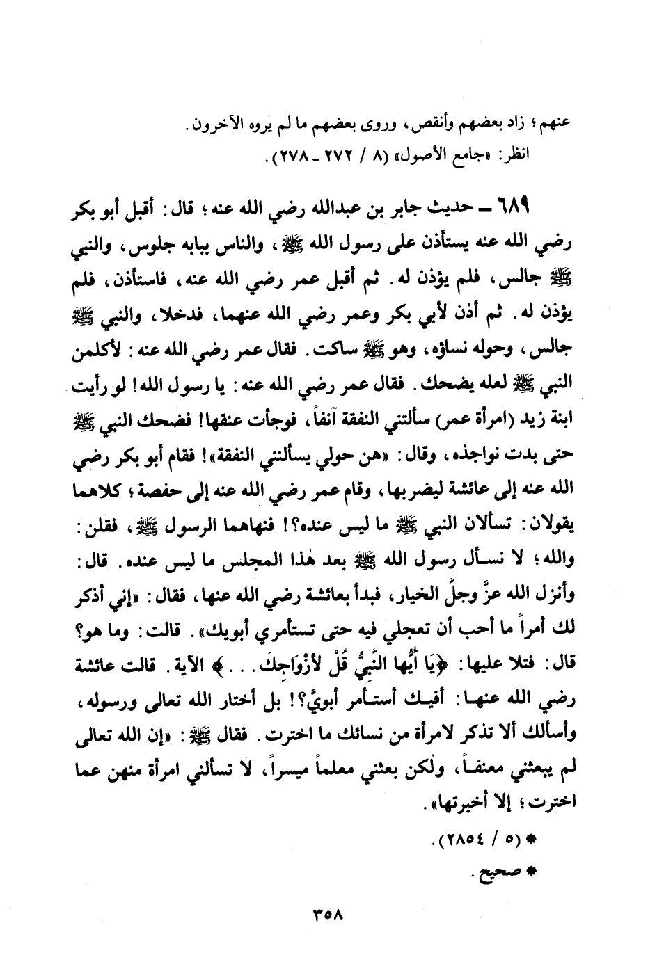 689 - حديث جابر بن عبد الله رضي الله عنه؛ قال: أقبل أبوبكر رضي الله عنه يستأذن على رسول الله صلى الله عليه وسلم، والناس ببابه جلوس، والنبي صلى الله عليه وسلم جالس، فلم يؤذن له. ثم أقبل عمر رضي الله عنه، فاستأذن، فلم يؤذن له. ثم أذن لأبي بكر وعمر رضي الله عنهما، فدخلا، والنبي صلى الله عليه وسلم جالس، وحوله نساؤه، وهو صلى الله عليه وسلم ساكت. فقال عمر رضي الله عنه: لأكلمن النبي صلى الله عليه وسلم لعله يضحك، فقال عمر رضي الله عنه: يا رسول الله! لو رأيت ابنة زيد (امرأة عمر) سألتني النفقة آنفاً، فوجأت عنقها! فضحك النبي صلى الله عليه وسلم حتى بدت نواجذه، وقال: ((هن حولي يسألنني النفقة)) ! فقام أبو بكر رضي الله عنه إلى عائشة ليضربها، وقام عمر رضي الله عنه إلى حفصة؛ كلاهما يقولان: تسألان النبي صلى الله عليه وسلم ما ليس عنده؟! فنهاهما الرسول صلى الله عليه وسلم، فقلن: والله؛ لا نسأل رسول الله صلى الله عليه وسلم بعد هذا المجلس ما ليس عنده. قال: وأنزل الله عزَّ وجلَّ الخيار، فبدأ بعائشة رضي الله عنها، فقال: ((إني أذكر لك أمراً ما أحب أن تعجلي فيه حتى تستأمري أبويك)) . قالت: وما هو؟ قال: فتلا عليها: {يَا أَيُّهَا النَّبِيُّ قُل لأَزْوَاجِكَ ... } الآية. قالت عائشة رضي الله عنها: أفيك أستأمر أبويَّ؟ ! بل أختار الله تعالى ورسوله، وأسألك ألا تذكر لامرأة من نسائك ما اخترت. فقال صلى الله عليه وسلم: ((إن الله تعالى لم يبعثني معنفاً، ولكن بعثني معلماً ميسراً، لا تسألني امرأة منهن عما اخترت؛ إلا أخبرتها)) .