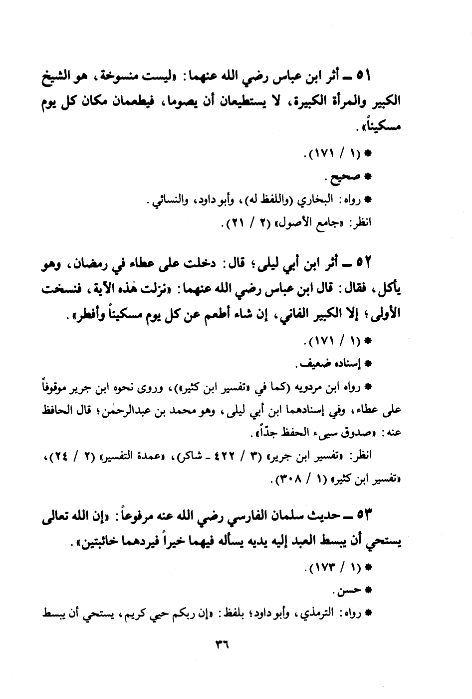 51 - أثر ابن عباس رضي الله عنهما: ((ليست منسوخة، هو الشيخ الكبير والمرأة الكبيرة، لا يستطيعان أن يصوما، فيطعمان مكان كل يوم مسكيناً)) .