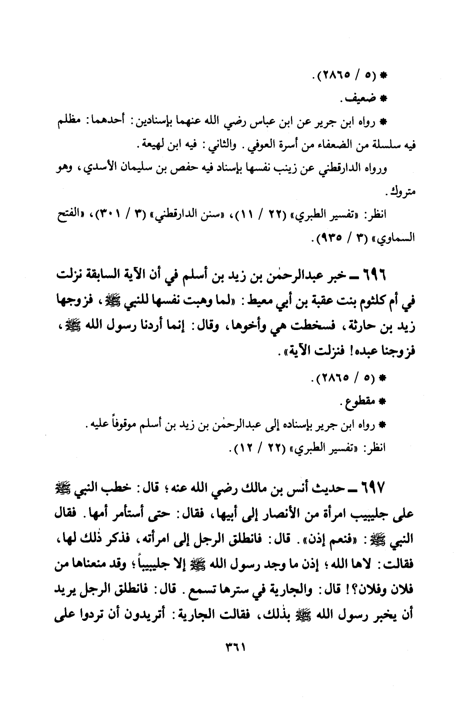 696 - خبر عبد الرحمن بن زيد بن أسلم في أن الآية السابقة نزلت في أم كلثوم بنت عقبة بن أبي معيط: ((لما وهبت نفسها للنبي صلى الله عليه وسلم، فزوجها زيد بن حارثة، فسخطت هي وأخوها، وقال: إنما أردنا رسول الله صلى الله عليه وسلم، فزوجنا عبده! فنزلت الآية)) .