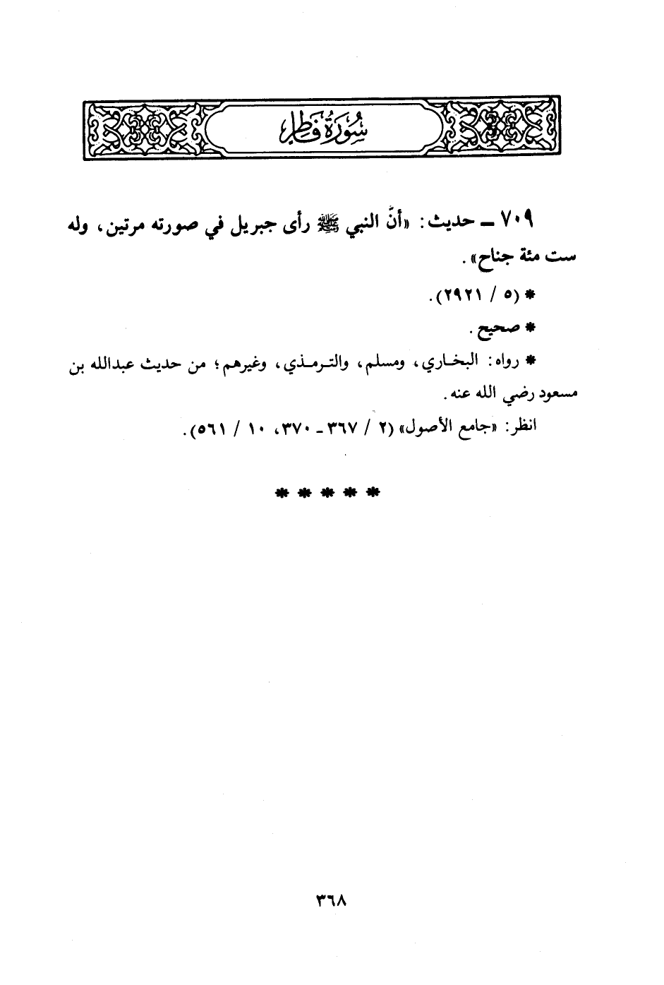 709 - حديث: ((أنَّ النبي صلى الله عليه وسلم رأى جبريل في صورته مرتين، وله ست مئة جناح)) .