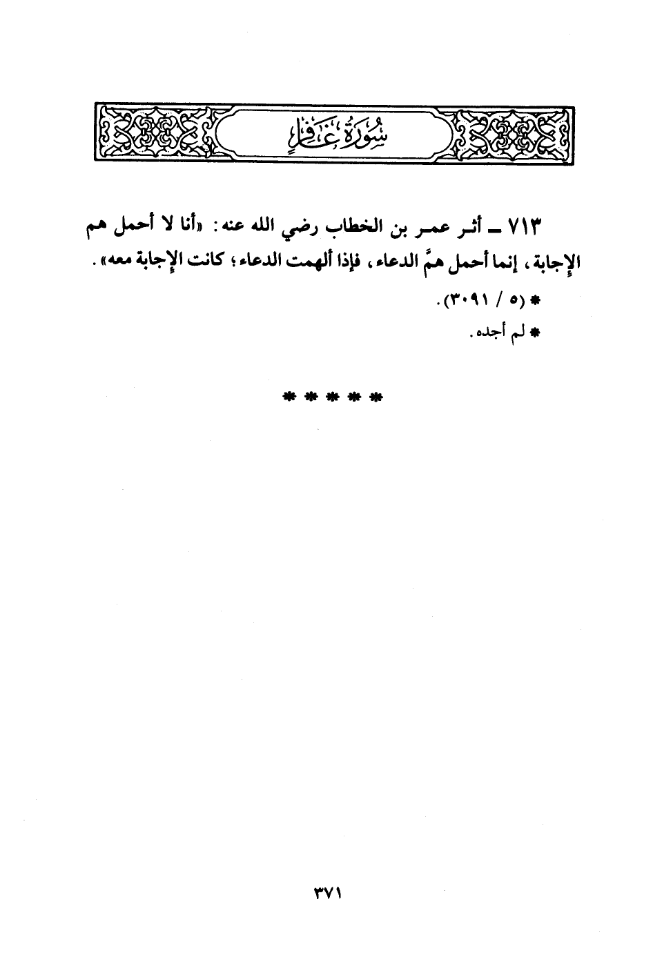 713 - أثر عمر بن الخطاب رضي الله عنه: ((أنا لا أحمل هم الإجابة، إنما أحمل همَّ الدعاء، فإذا ألهمت الدعاء؛ كانت الإجابة معه)) .