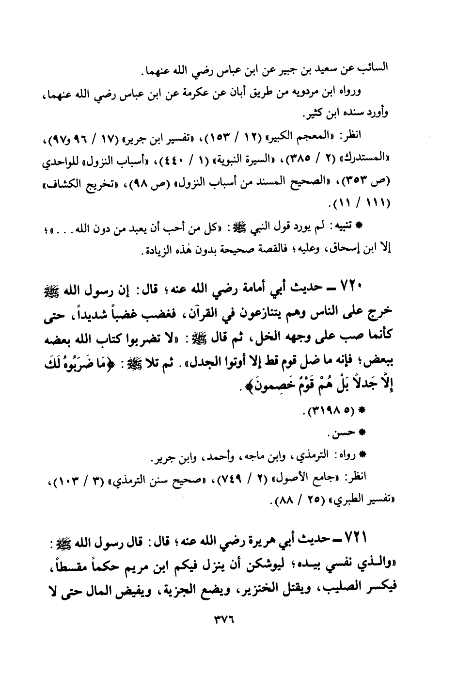 720 - حديث أبي أمامة رضي الله عنه؛ قال: إن رسول الله صلى الله عليه وسلم خرج على الناس وهم يتنازعون في القرآن، فغضب غضباً شديداً، حتى كأنما صب على وجهه الخل، ثم قال صلى الله عليه وسلم: ((لا تضربوا كتاب الله بعضه ببعض؛ فإنه ما ضل قوم قط إلا أوتوا الجدل)) . ثم تلا صلى الله عليه وسلم: {مَا ضَرَبُوهُ لَكَ إِلاَّ جَدَلاً بَلْ هُمْ قَوْمٌ خَصِمُونَ} .
