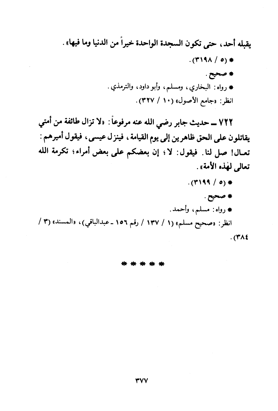 722 - حديث جابر رضي الله عنه مرفوعاً: ((لا تزال طائفة من أمتي يقاتلون على الحق ظاهرين إلى يوم القيامة، فينزل عيسى، فيقول أميرهم: تعال! صلِّ لنا. فيقول: لا؛ إن بعضكم على بعض أمراء؛ تكرمة الله تعالى لهذه الأمة)) .