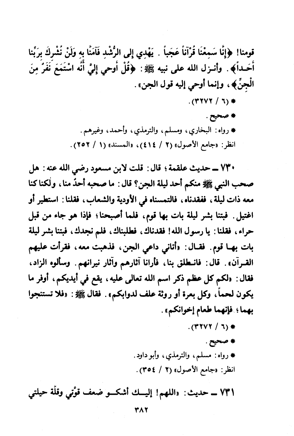 730 - حديث علقمة؛ قال: قلت لابن مسعود رضي الله عنه: هل صحب النبي صلى الله عليه وسلم منكم أحد ليلة الجن؟ قال: ما صحبه أحدٌ منا، ولكنا كنا معه ذات ليلة، ففقدناه، فالتمسناه في الأودية والشعاب، فقلنا: استطير أو اغتيل. فبتنا بشر ليلة بات بها قوم، فلما أصبحنا؛ فإذا هو جاء من قبل حراء، فقلنا: يا رسول الله! فقدناك، فطلبناك، فلم نجدك، فبتنا بشر ليلة بات بها قوم. فقال: ((أتاني داعي الجن، فذهبت معه، فقرأت عليهم القرآن)) . قال: فانطلق بنا، فأرانا آثارهم وآثار نيرانهم، وسألوه الزاد، فقال: ((لكم كل عظم ذكر اسم الله تعالى عليه، يقع في أيديكم، أوفر ما يكون لحماً، وكل بعرة أو روثة علف لدوابكم)) . فقال صلى الله عليه وسلم: ((فلا تستنجوا بهما؛ فإنه طعام إخوانكم)) .