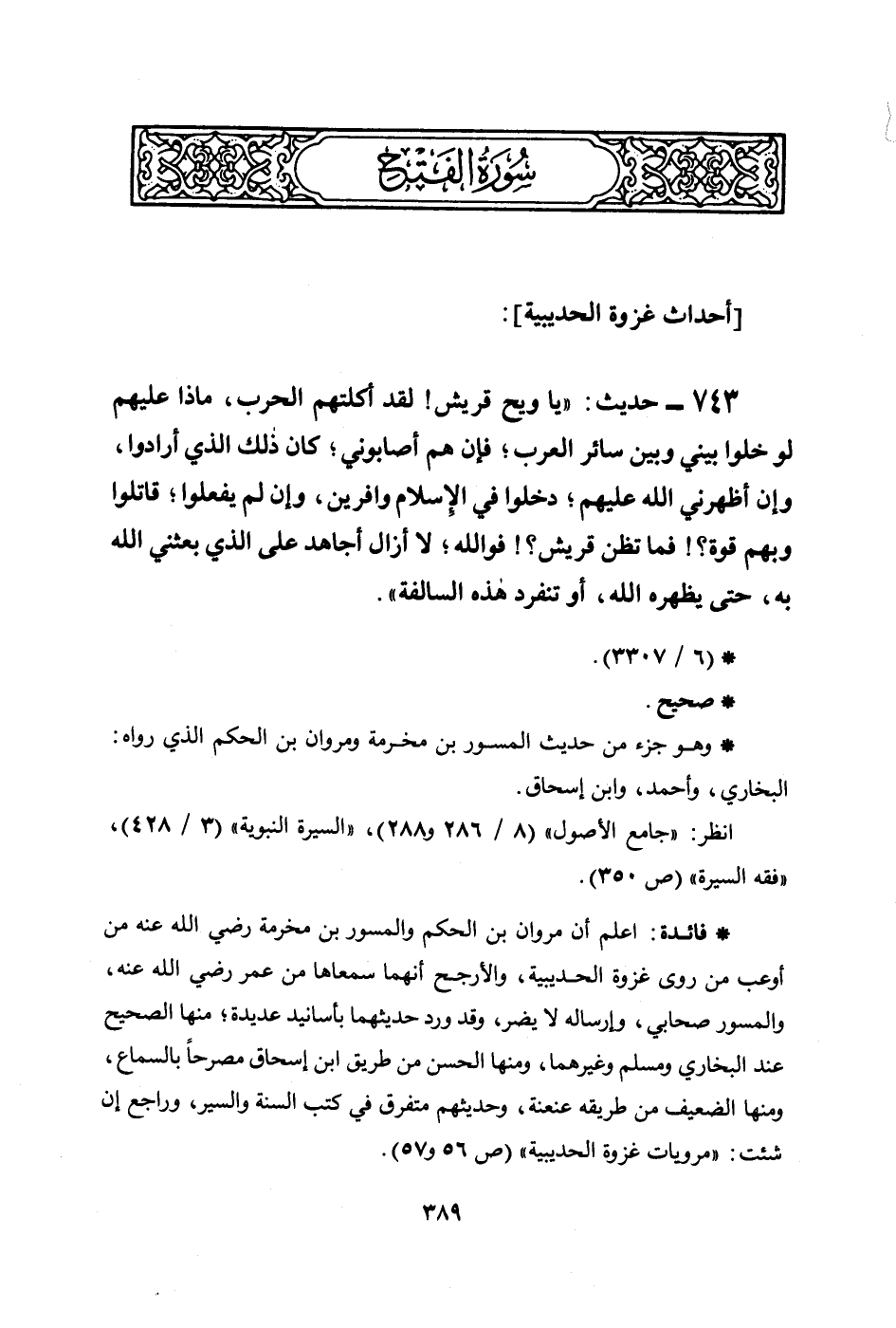 - فائدة: اعلم أن مروان بن الحكم والمسور بن مخرمة رضي الله عنه من أوعب من روى غزوة الحديبية، والأرجح أنهما سمعاها من عمر رضي الله عنه، والمسور صحابي، وإرساله لا يضر، وقد ورد حديثهما بأسانيد عديدة؛ منها الصحيح عند البخاري ومسلم وغيرهما، ومنها الحسن من طريق ابن إسحاق مصرحاً بالسماع، ومنها الضعيف من طريقه عنعنة، وحديثهم متفرق في كتب السنة والسير، وراجع إن شئت: ((مرويات غزوة الحديبية)) (ص56 و57) .