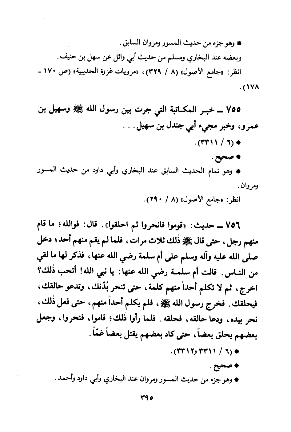 756 - حديث: ((قوموا فانحروا ثم احلقوا)) . قال: فوالله؛ ما قام منهم رجل، حتى قال صلى الله عليه وسلم ذلك ثلاث مرات، فلما لم يقم منهم أحد؛ دخل صلى الله عليه وآله وسلم على أم سلمة رضي الله عنها، فذكر لها ما لقي من الناس. قالت أم سلمة رضي الله عنها: يا نبي الله! أتحب ذلك؟ اخرج، ثم لا تكلم أحداً منهم كلمة، حتى تنحر بُدْنك، وتدعو حالقك، فيحلقك. فخرج رسول الله صلى الله عليه وسلم، فلم يكلم أحداً منهم، حتى فعل ذلك، نحر بيده، ودعا حالقه، فحلقه، فلما رأوا ذلك؛ قاموا، فنحروا، وجعل بعضهم يحلق بعضاً، حتى كاد بعضهم يقتل بعضاً غمَّاً.