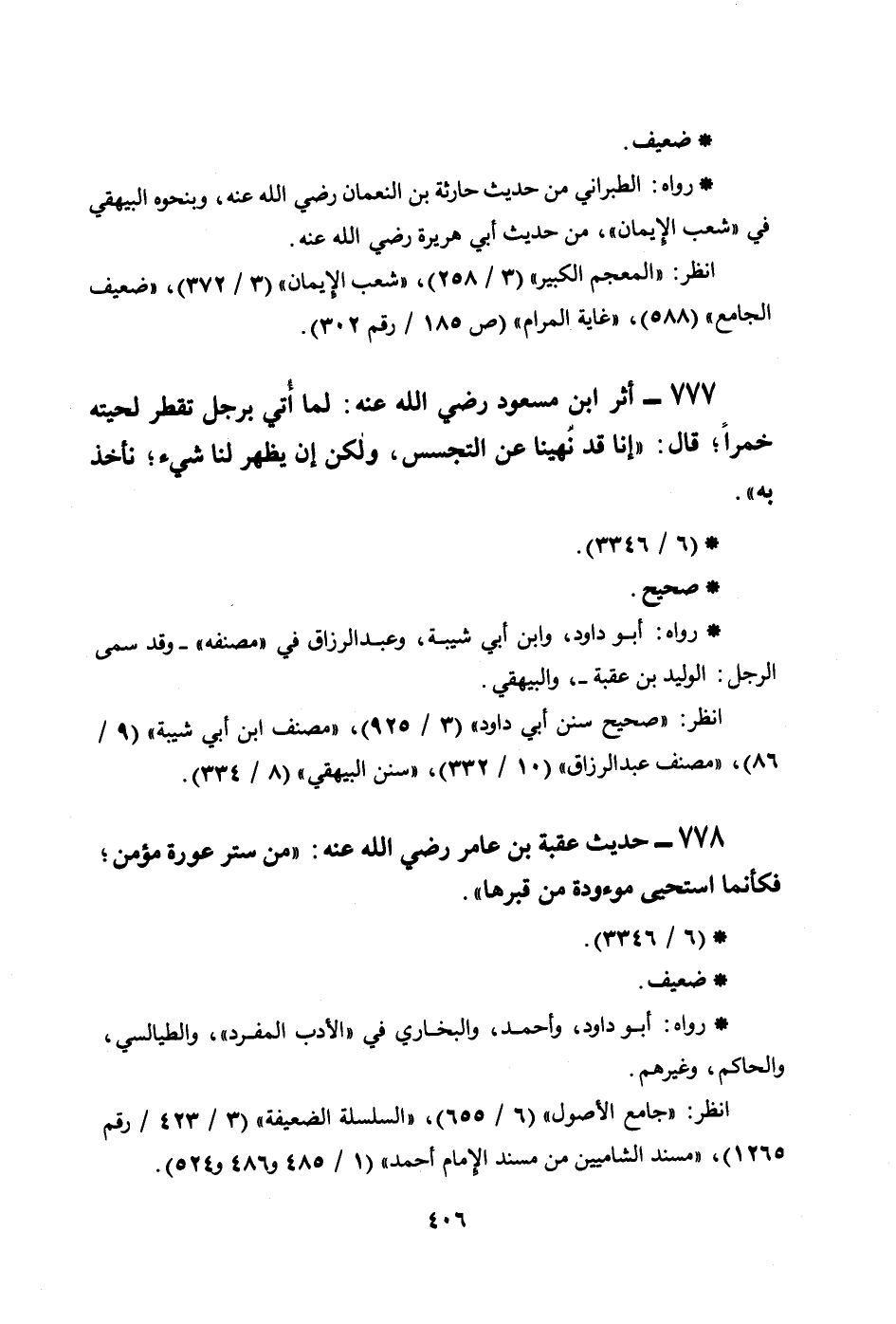 777 - أثر ابن مسعود رضي الله عنه: لما أُتي برجل تقطر لحيته خمراً؛ قال: ((إنا قد نُهينا عن التجسس، ولكن إن يظهر لنا شيء؛ نأخذ به)) .