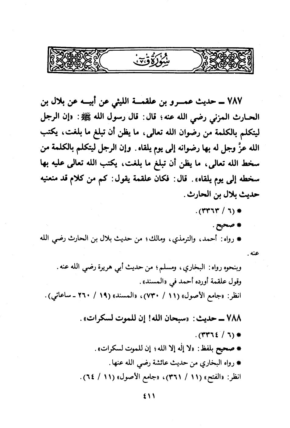 787 - حديث عمرو بن علقمة الليثي عن أبيه عن بلال بن الحارث المزني رضي الله عنه؛ قال: قال رسول الله صلى الله عليه وسلم: ((إن الرجل ليتكلم بالكلمة من رضوان الله تعالى، ما يظن أن تبلغ ما بلغت، يكتب الله عزَّ وجلَّ له بها رضوانه إلى يوم يلقاه. وإن الرجل ليتكلم بالكلمة من سخط الله تعالى، ما يظن أن تبلغ ما بلغت، يكتب الله تعالى عليه بها سخطه إلى يوم يلقاه)) . قال: فكان علقمة يقول: كم من كلام قد منعنيه حديث بلال بن الحارث.