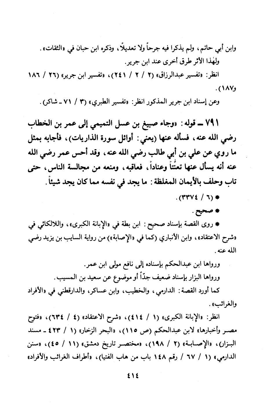 791 - قوله: ((وجاء صبيغ بن عسل التميمي إلى عمر بن الخطاب رضي الله عنه، فسأله عنها (يعني: أوائل سورة الذاريات) ، فأجابه بمثل ما روي عن علي بن أبي طالب رضي الله عنه، وقد أحس عمر رضي الله عنه أنه يسأل عنها تعنُّتاً وعناداً، فعاقبه، ومنعه من مجالسة الناس، حتى تاب وحلف بالأيمان المغلظة: ما يجد في نفسه مما كان يجد شيئاً.