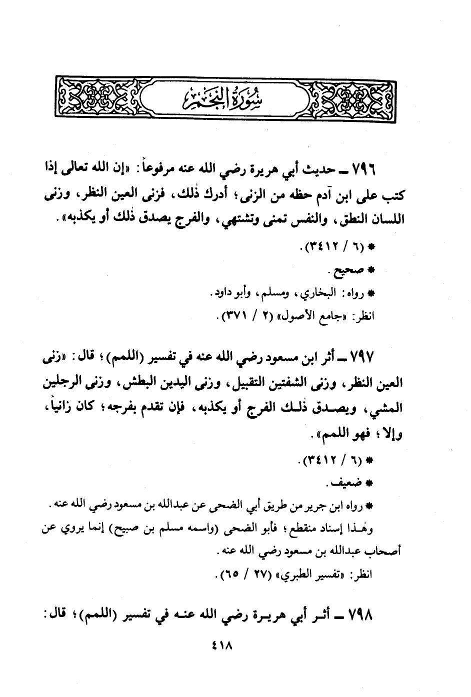 798 - أثر أبي هريرة رضي الله عنه في تفسير (اللمم)) ؛ قال: