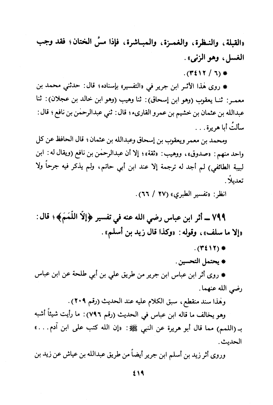799 - أثر ابن عباس رضي الله عنه في تفسير {إِلاَّ اللَّمَمَ} ؛ قال: ((إلا ما سلف)) ، وقوله: ((وكذا قال زيد بن أسلم)) .