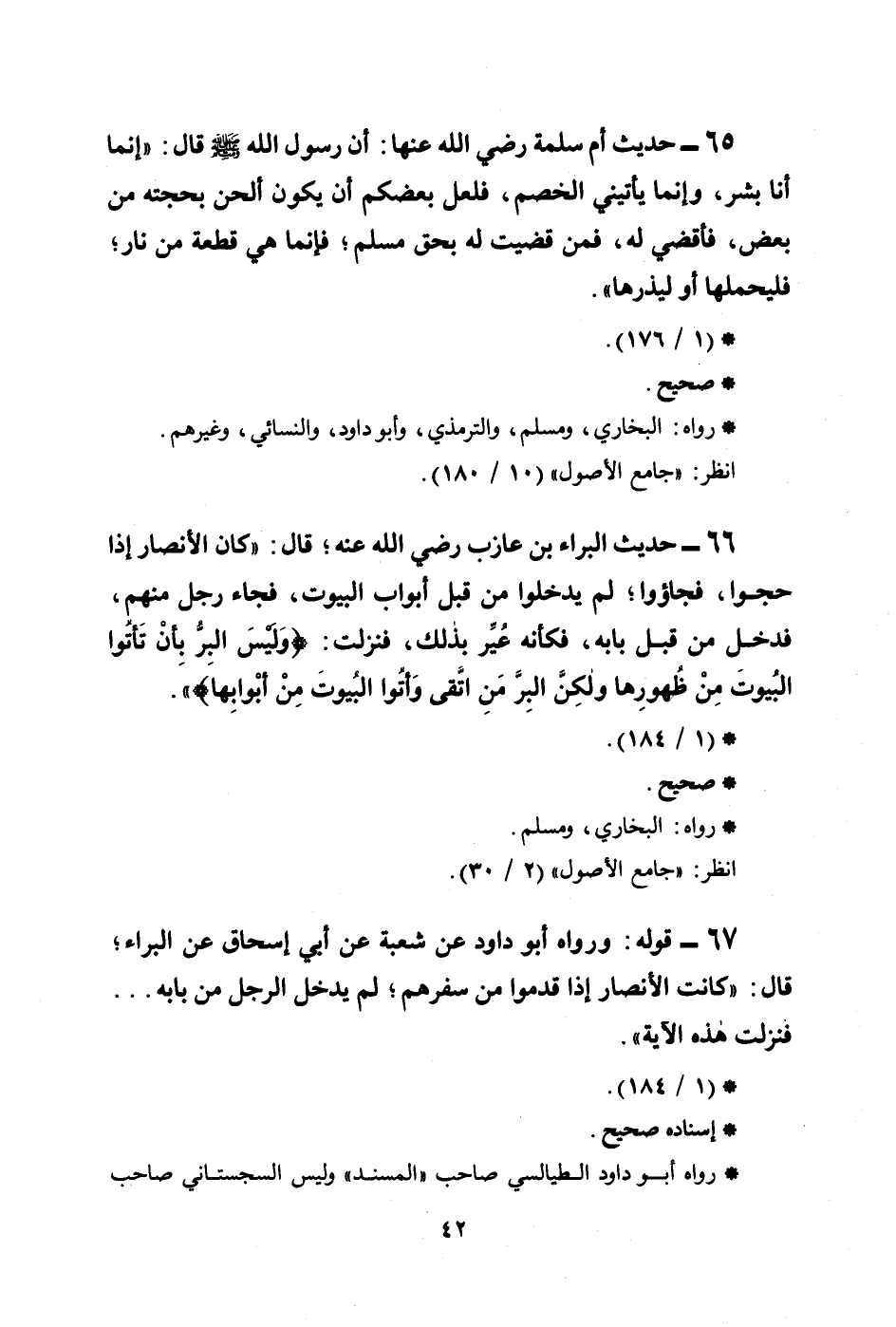 66 - حديث البراء بن عازب رضي الله عنه؛ قال: ((كان الأنصار إذا حجُّوا، فجاؤوا؛ لم يدخلوا من قبل أبواب البيوت، فجاء رجل منهم، فدخل من قبل بابه، فكأنه عُيِّر بذلك، فنزلت: {وَلَيْسَ الْبِرُّ بِأَن تَأْتُوا الْبُيُوتَ مِن ظُهُورَهَا وَلَكِنَّ الْبِرَّ مَنِ اتَّقَى وَأْتُوا الْبُيُوتَ مِنْ أَبْوَابِهَا} )) .