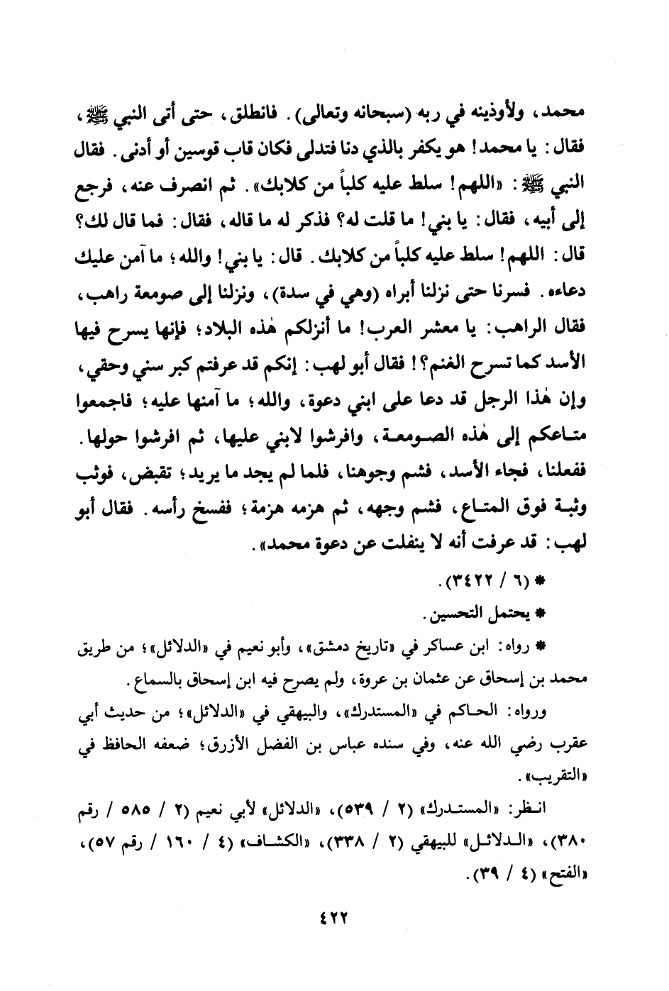 محمد، ولأوذينه في ربه (سبحانه وتعالى) . فانطلق، حتى أتى النبي صلى الله عليه وسلم، فقال: يا محمد! هو يكفر بالذي دنا فتدلى فكان قاب قوسين أو أدنى. فقال النبي صلى الله عليه وسلم: ((اللهم! سلط عليه كلباً من كلابك)) . ثم انصرف عنه، فرجع إلى أبيه، فقال: يا بني! ما قلت له؟ فذكر له ما قاله، فقال: فما قال لك؟ قال: اللهم! سلط عليه كلباً من كلابك. قال: يا بني! والله؛ ما آمن عليك دعاءه. فسرنا حتى نزلنا أبراه (وهي في سدة) ، ونزلنا إلى صومعة راهب، فقال الراهب: يا معشر العرب! ما أنزلكم هذه البلاد؛ فإنها يسرح فيها الأسد كما تسرح الغنم؟! فقال أبو لهب: إنكم قد عرفتم كبر سني وحقي، وإن هذا الرجل قد دعا على ابني دعوة، والله؛ ما آمنها عليه؛ فاجمعوا متاعكم إلى هذه الصومعة، وافرشوا لابني عليها، ثم افرشوا حولها. ففعلنا، فجاء الأسد، فشم وجوهنا، فلم يجد ما يريد؛ تقبض، فوثب وثبة فوق المتاع، فشم وجهه، ثم هزمه هزمة؛ ففسخ رأسه. فقال أبو لهب: قد عرفت أنه لا ينفلت عن دعوة محمد)) .