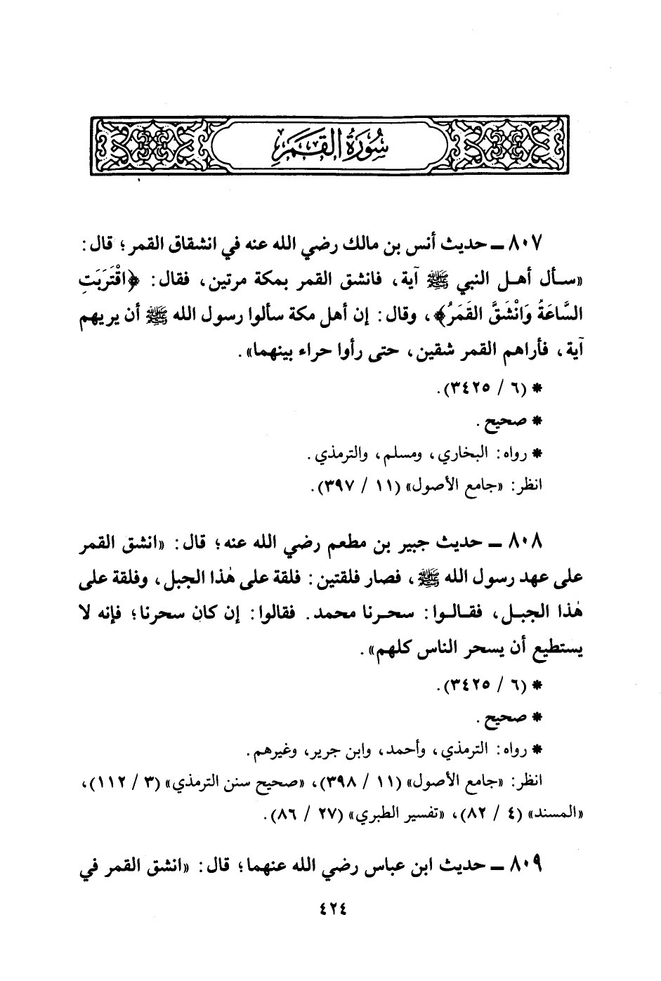 807 - حديث أنس بن مالك رضي الله عنه في انشقاق القمر؛ قال: ((سأل أهل مكة النبي صلى الله عليه وسلم آية، فانشق القمر بمكة مرتين، فقال: {اقَتَرَبَتِ السَّاعَةُ وَانشَقَّ الْقَمَرُ} ، وقال: إن أهل مكة سألوا رسول الله صلى الله عليه وسلم أن يريهم آية، فأراهم القمر شقين، حتى رأوا حراء بينهما.