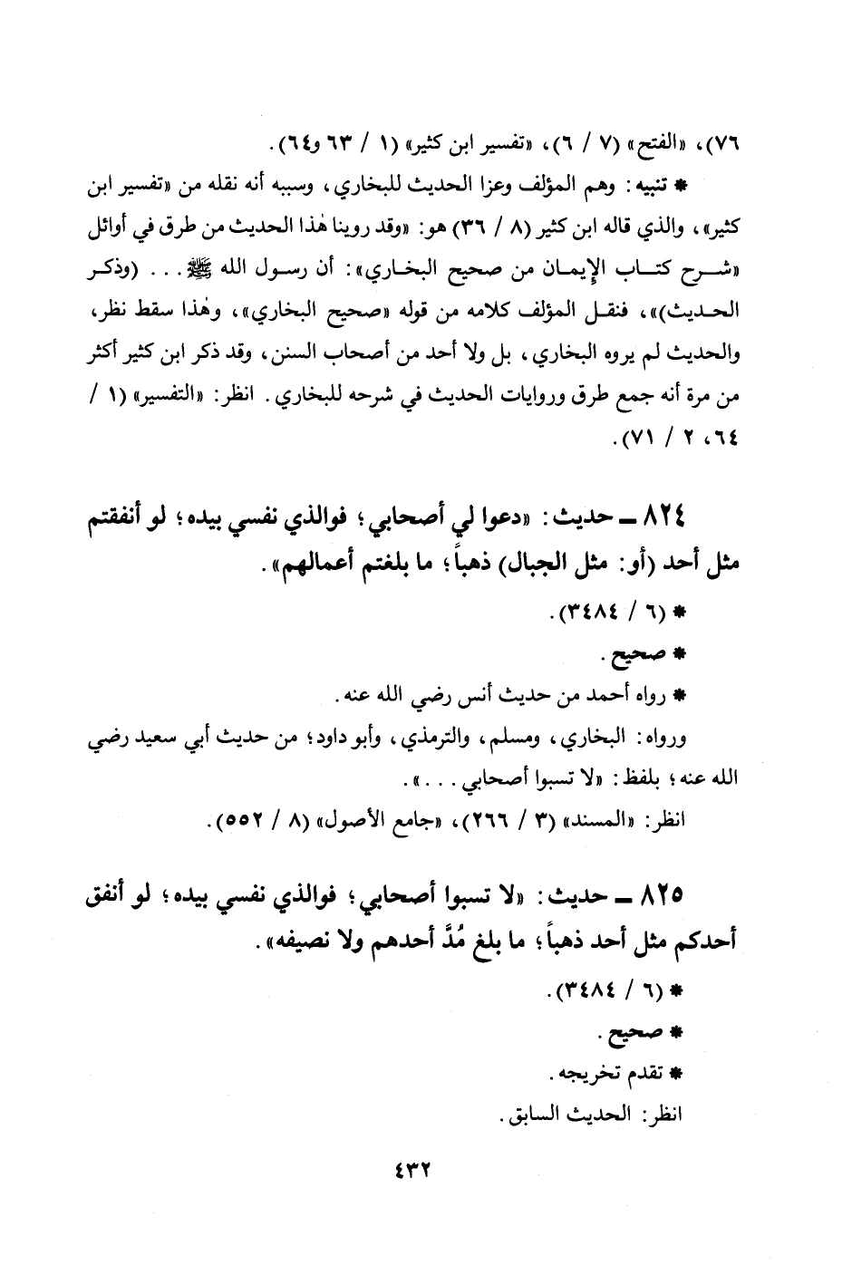 825 - حديث: ((لا تسبوا أصحابي؛ فوالذي نفسي بيده؛ لو أنفق أحدكم مثل أحد ذهباً؛ ما بلغ مُدَّ أحدهم ولا نصيفه)) .