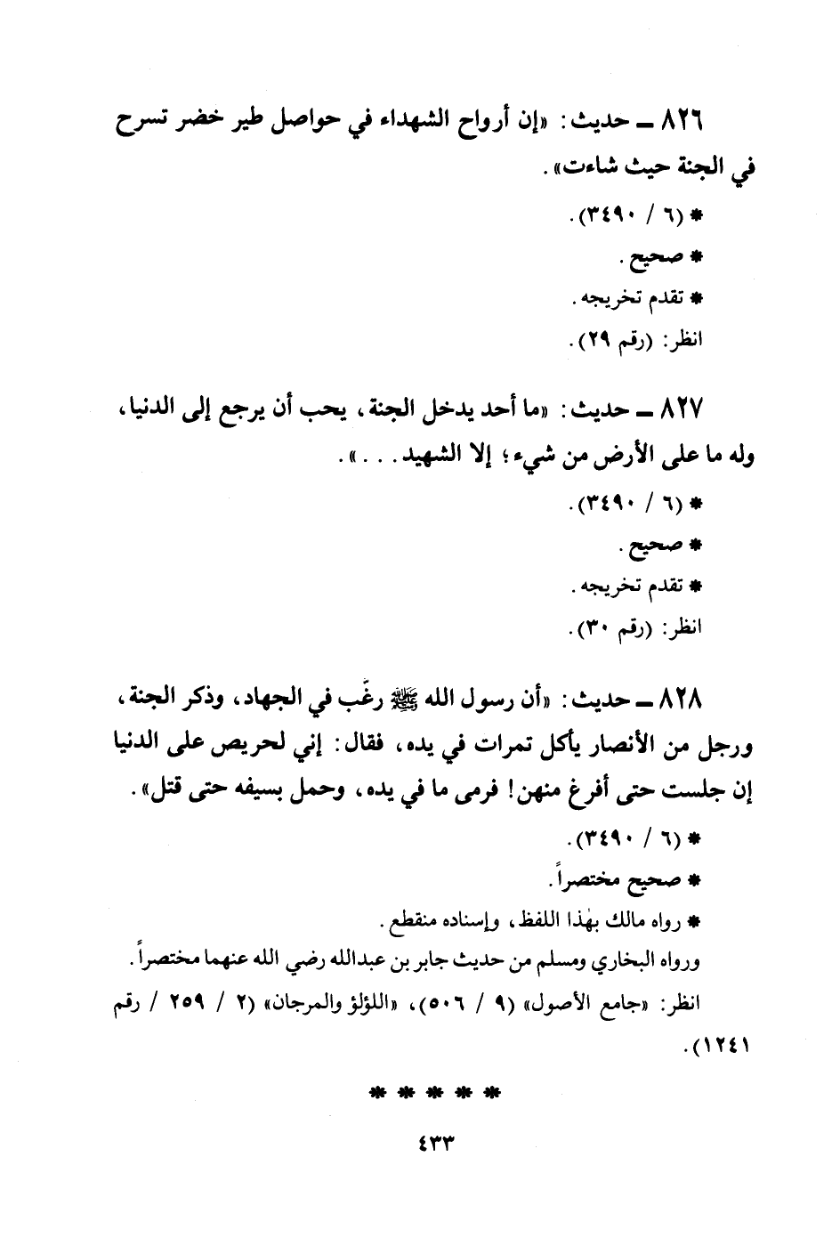826 - حديث: ((إن أرواح الشهداء في حواصل طير خضر تسرح في الجنة حيث شاءت)) .