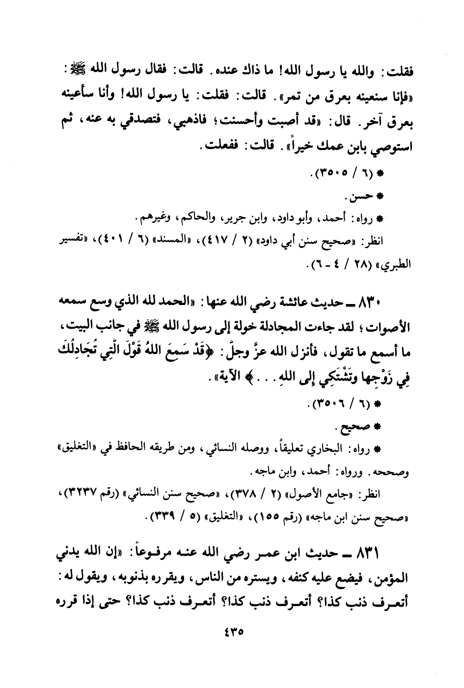 830 - حديث عائشة رضي الله عنها: ((الحمد لله الذي وسع سمعه الأصوات؛ لقد جاءت المجادلة خولة إلى رسول الله صلى الله عليه وسلم في جانب البيت، ما أسمع ما تقول، فأنزل اله عزَّ وجلَّ: {قَدْ سَمِعَ اللهُ قَوْلَ الَّتِي تُجَادِلُكَ فِي زَوْجِهَا وَتَشْتَكِي إِلَى اللهِ ... } الآية)) .