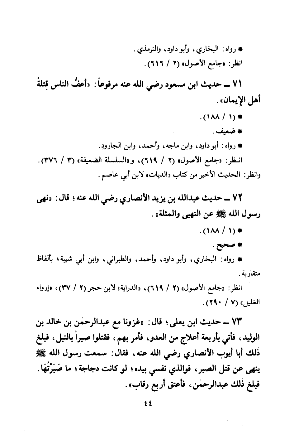 73 - حديث ابن يعلى؛ قال: ((غزونا مع عبد الرحمن بن خالد ابن الوليد، فأُتي بأربعة أعلاج من العدو، فأمر بهم، فقتلوا صبراً بالنبل، فبلغ ذلك أبا أيوب الأنصاري رضي الله عنه، فقال: سمعت رسول الله صلى الله عليه وسلم ينهى عن قتل الصبر، فوالذي نفسي بيده؛ لو كانت دجاجة؛ ما صَبَرْتُهَا. فبلغ ذلك عبد الرحمن، فأعتق أربع رقاب)) .