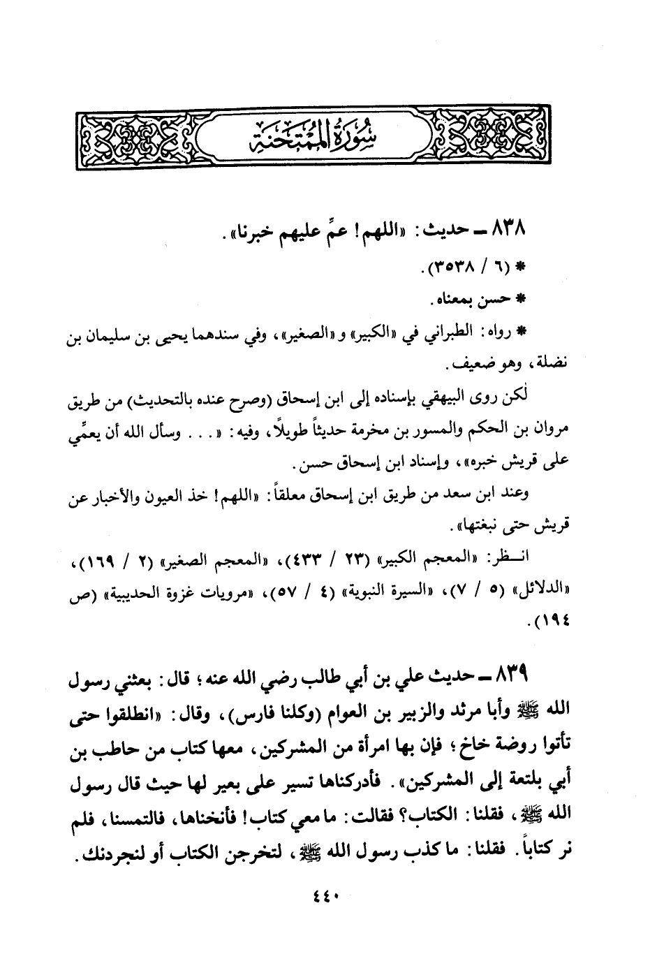 839 - حديث علي بن أبي طالب رضي الله عنه؛ قال: بعثني رسول الله صلى الله عليه وسلم وأبا مرثد والزبير بن العوام (وكلنا فارس) ، وقال: ((انطلقوا حتى تأتوا روضة خاخ؛ فإن بها امرأة من المشركين، معها كتاب من حاطب بن أبي بلتعة إلى المشركين)) . فأدركناها تسير على بعير لها حيث قال رسول الله صلى الله عليه وسلم، فقلنا: الكتاب؟ فقالت: ما معي كتاب! فأنخناها، فالتمسنا، فلم نركتاباً، فقلنا: ما كذب رسول الله صلى الله عليه وسلم، لتخرجن الكتاب أو لنجردنك.