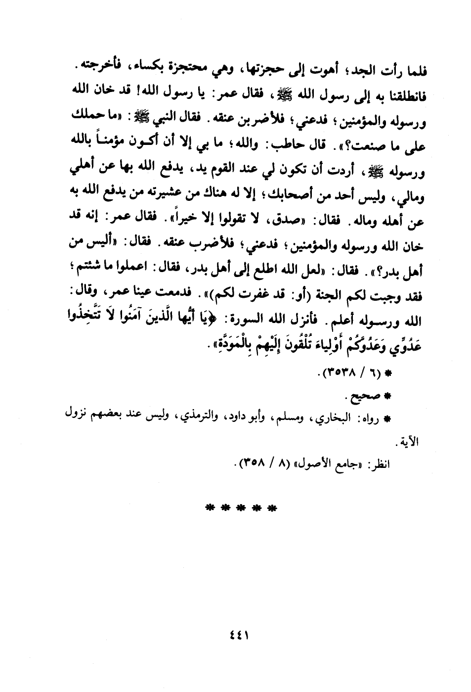 فلما رأت الجد؛ أهوت إلى حجزتها، وهي محتجزة بكساء، فأخرجته. فانطلقنا به إلى رسول الله صلى الله عليه وسلم، فقال عمر: يا رسول الله! قد خان الله ورسوله والمؤمنين؛ فدعني؛ فلأضربن عنقه. فقال النبي صلى الله عليه وسلم: ((ما حملك على ما صنعت؟)) . قال حاطب: والله؛ ما بي إلا أن أكون مؤمناً بالله ورسوله صلى الله عليه وسلم، أردت أن تكون لي عند القوم يد، يدفع الله بها عن أهلي ومالي، وليس أحد من أصحابك؛ إلا له هناك من عشيرته من يدفع الله به عن أهله وماله. فقال: ((صدق، لا تقولوا إلا خيراً)) . فقال عمر: إنه قد خان الله ورسوله والمؤمنين؛ فدعني؛ فلأضرب عنقه. فقال: ((أليس من أهل بدر؟)) . فقال: ((لعل الله اطلع إلى أهل بدر فقال: اعملوا ما شئتم؛ فقد وجبت لكم الجنة (أو: قد غفرت لكم)) ) . فدمعت عينا عمر، وقال: الله ورسوله أعلم. فأنزل الله السورة: {يَا أَيُّهَا الَّذِينَ آمَنُوا لاَ تَتَّخِذُوا عَدُوِّي وَعَدُوَّكُمْ أَوْلِيَاءَ تُلْقُونَ إِلَيْهِم بِالْمَوَدَّةِ} .