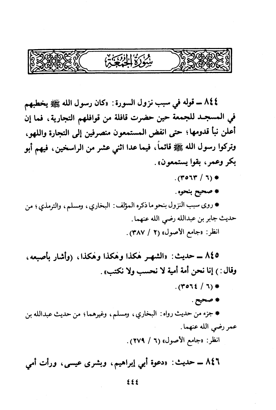 844 - قوله في سبب نزول السورة: ((كان رسول الله صلى الله عليه وسلم يخطبهم في المسجد للجمعة حين حضرت قافلة من قوافلهم التجارية، فما إن أعلن نبأ قدومها؛ حتى انفض المستمعون منصرفين إلى التجارة واللهو، وتركوا رسول الله صلى الله عليه وسلم قائماً، فيما عدا اثني عشر من الراسخين، فيهم أبو بكر وعمر، بقوا يستمعون)) .