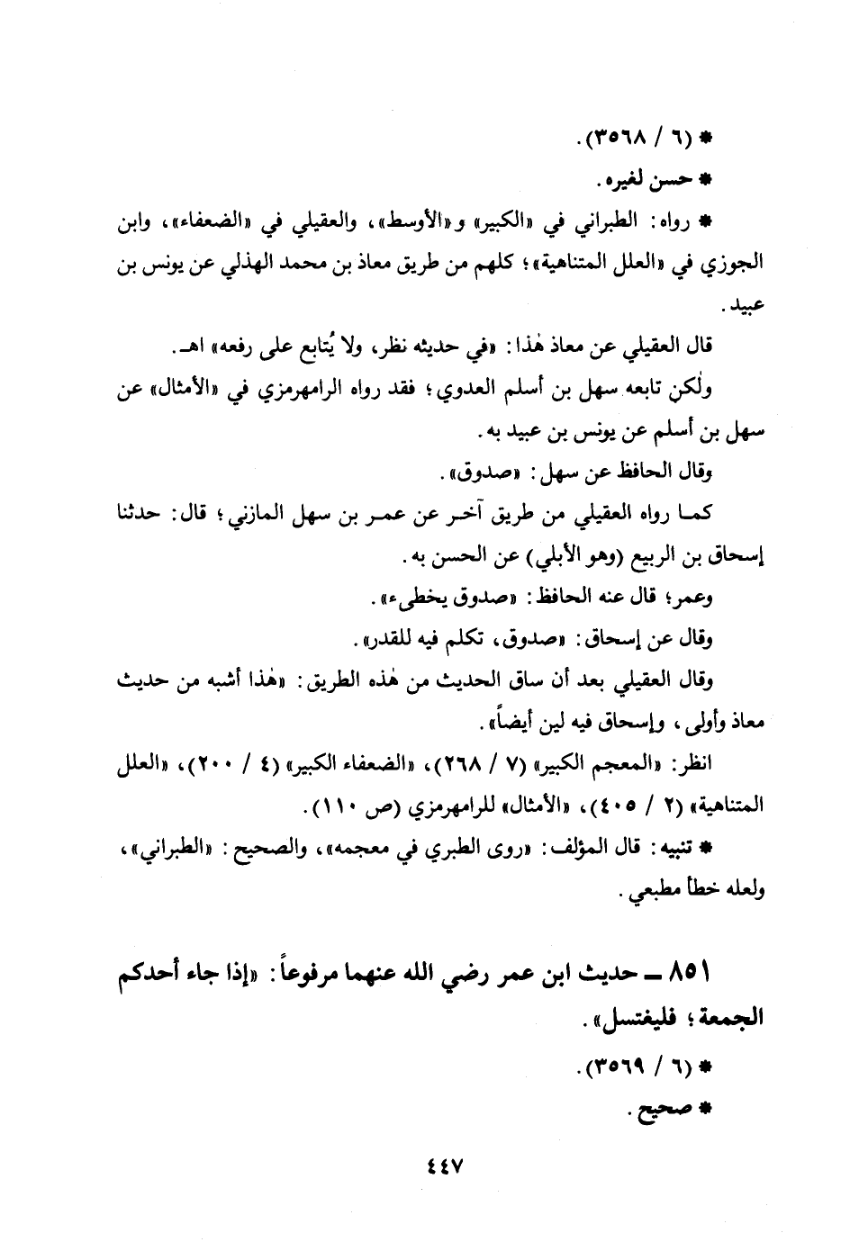 قال العقيلي عن معاذ هذا: ((في حديثه نظر، ولا يُتابع على رفعه)) اهـ.