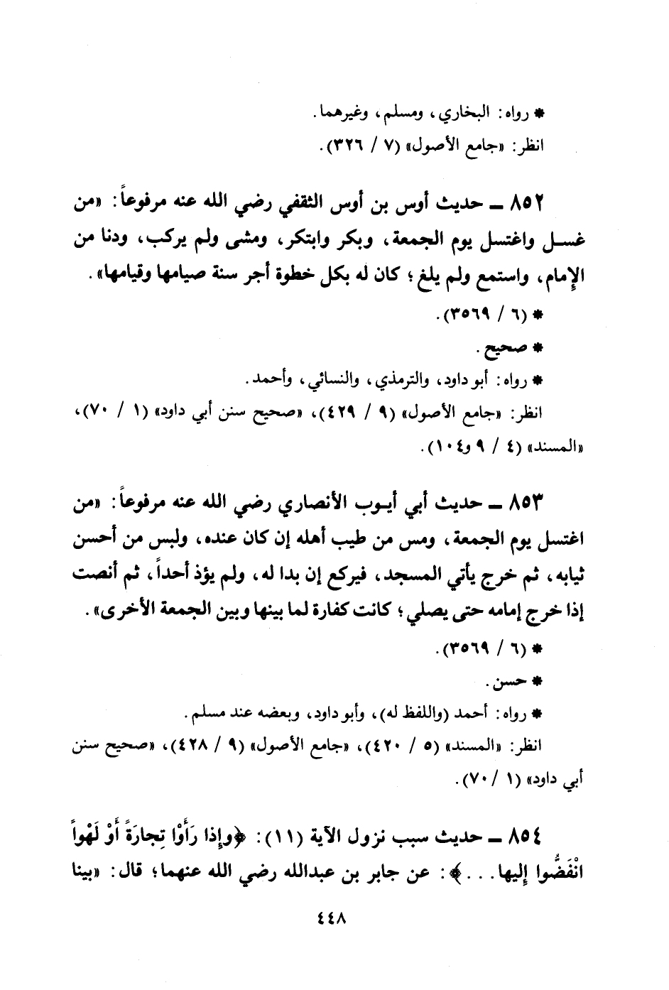 852 - حديث أوس بن أوس الثقفي رضي الله عنه مرفوعاً: ((من غسل واغتسل يوم الجمعة، وبكر وابتكر، ومشى ولم يركب، ودنا من الإمام، واستمع ولم يلغُ؛ كان له بكل خطوة أجر سنة صيامها وقيامها)) .