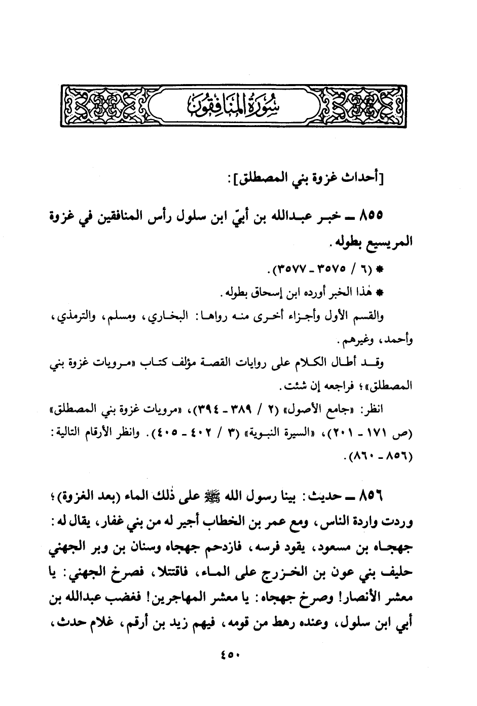855 - خبر عبد الله بن أبي بن سلول رأس المنافقين في غزوة المريسيع بطوله.