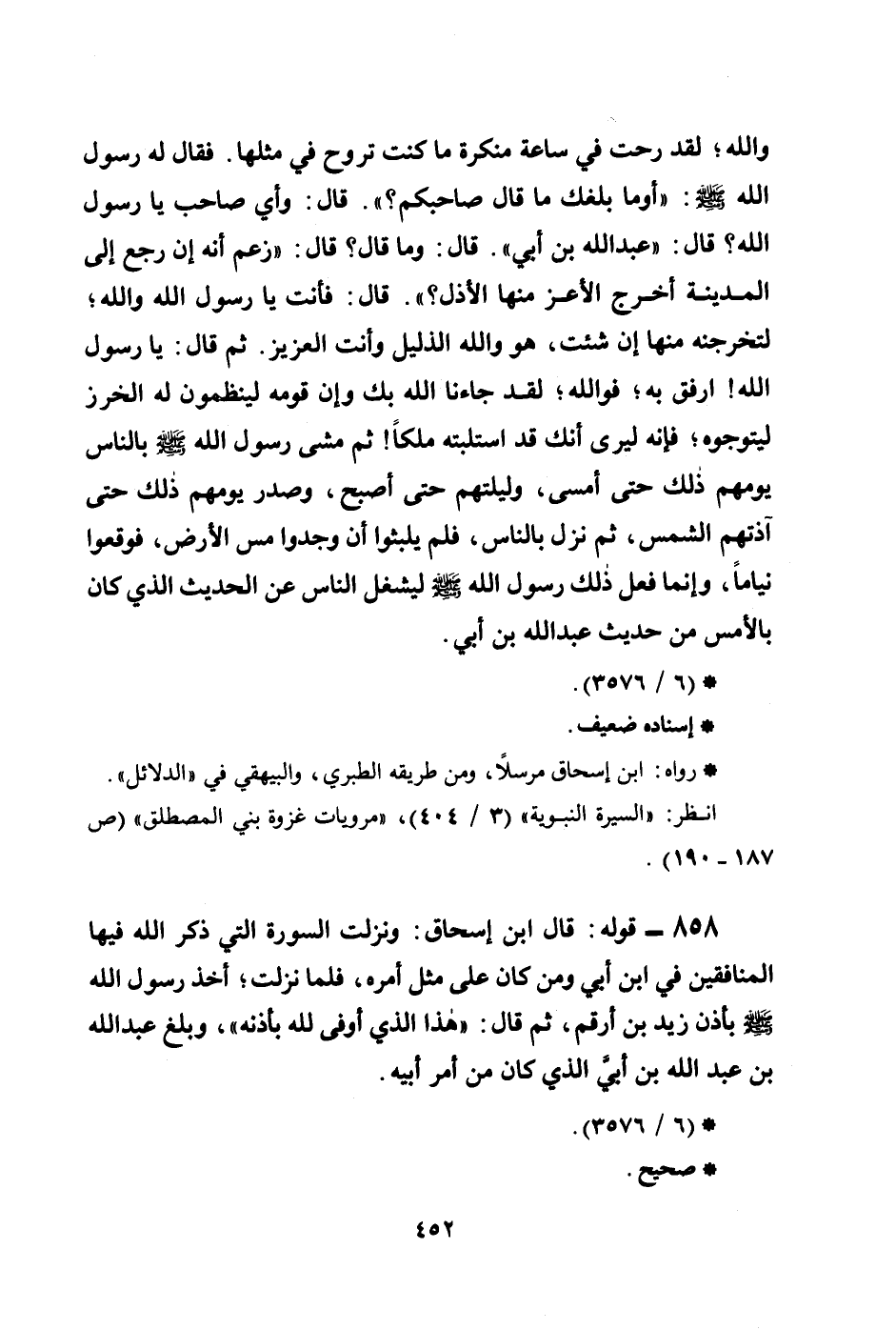 858 - قوله: قال ابن إسحاق: ونزلت السورة التي ذكر الله فيها المنافقين في ابن أبي ومن كان على مثل أمره، فلما نزلت؛ أخذ رسول الله صلى الله عليه وسلم بأذن زيد بن أرقم، ثم قال: ((هذا الذي أوفى لله بأذنه)) ، وبلغ عبد الله بن عبد الله بن أبيَّ الذي كان من أمر أبيه.