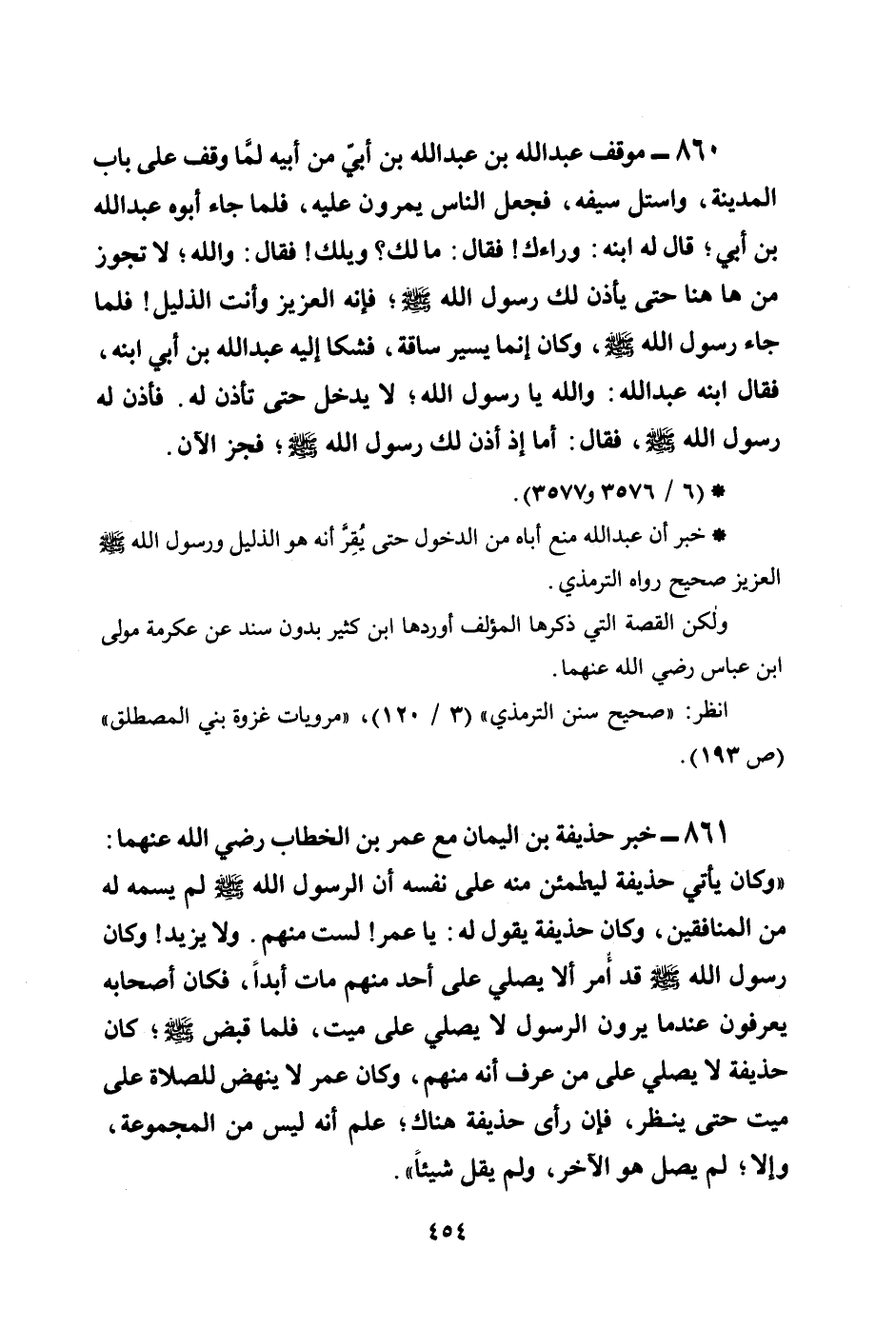 860 - موقف عبد الله بن عبد الله بن أبي من أبيه لمَّا وقف على باب المدينة، واستل سيفه، فجعل الناس يمرون عليه، فلما جاء أبوه عبد الله بن أبي؛ قال له ابنه: وراءك! فقال: مالك؟ ويلك! فقال: والله؛ لا تجوز من هاهنا حتى يأذن لك رسول الله صلى الله عليه وسلم؛ فإنه العزيز وأنت الذليل! فلما جاء رسول الله صلى الله عليه وسلم، وكان إنما يسير ساقة، فشكا إليه عبد الله بن أبي ابنه، فقال ابنه عبد الله: والله يا رسول الله؛ لا يدخل حتى تأذن له. فأذن له رسول الله صلى الله عليه وسلم، فقال: أما إذ أذن لك رسول الله صلى الله عليه وسلم؛ فجز الآن.
