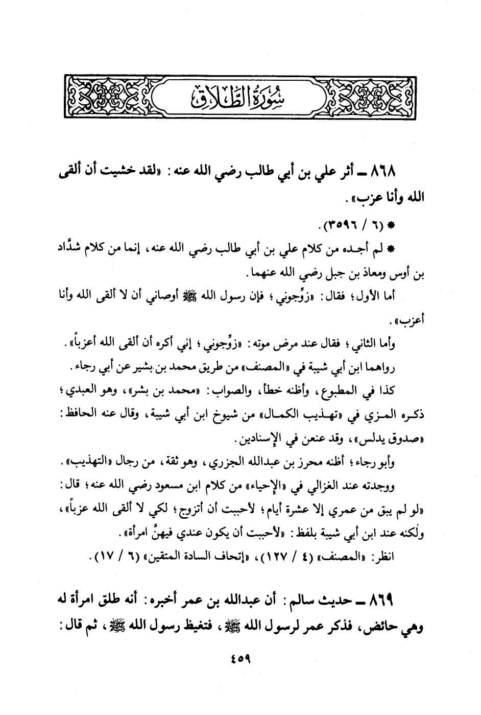 868 - أثر علي بن أبي طالب رضي الله عنه: ((لقد خشيت أن ألقى الله وأنا عزب) .