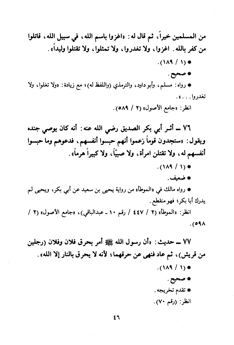 76 - أثر أبي بكر الصديق رضي الله عنه: أنه كان يوصي جنده ويقول: ((ستجدون قوماً زعموا أنهم حبسوا أنفسهم، فدعوهم وما حبسوا أنفسهم له، ولا تَقْتُلَنَّ امرأة، ولا صبيَّاً، ولا كبيراً هَرِماً)) .
