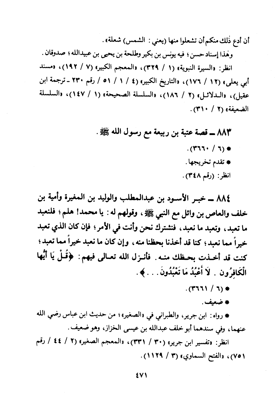884 - خبر الأسود بن عبد المطلب والوليد بن المغيرة وأمية بن خلف والعاص بن وائل مع النبي صلى الله عليه وسلم، وقولهم له: يا محمد! هلم؛ فلنعبد ما تعبد، وتعبد ما نعبد، فنشترك نحن وأنت في الأمر؛ فإن كان الذي تعبد خيراً مما نعبد؛ كنا قد أخذنا بحظنا منه، وإن كان ما نعبد خيراً مما تعبد؛ كنت قد أخذت بحظك منه. فأنزل الله تعالى فيهم: {قُلْ يَا أَيُّهَا الْكَافِرُونَ * لاَ أَعْبُدُ مَا تَعْبُدُونَ ... } .